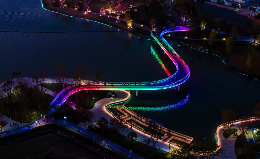 The floating bridge connects the north and south banks of Yuhu Lake, and the whole bridge adopts a double-curved design. During the day, it quietly reflects on the lake surface, becoming an excellent viewing spot. At night, the bridge body shines with colorful lights and shadows, just like a rainbow spanning the lake, adding more dreamy colors to the night tour.