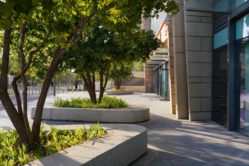 作为场地的第一城市界面,入口广场承担着城市界面的形象昭示,同时作为办公和商业综合体的昭示性外展空间,场地与城市街道用绿植分隔形成城市界面,引入自然绿色景观和建筑、城市整合联动形成完整的街景风貌,并在城市中央创造一片都市生活和自然理想的绿洲。