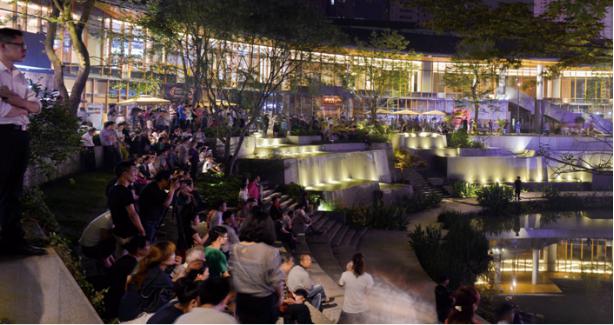 在地性就是一种文化表现。研究使用者的生活习惯,使之更好的服务所在街区。每条街道所在街区都有其人群的文化特色,要把这些发掘出来,结合进街道空间和景观元素的设计中才能体现特色,呈现出丰富的街区形态[6]。北京望京SOHO项目中景观呼应其建筑标志性的流线型设计,利用动感、流畅的线条,既回应了建筑的形态风格,又在解决竖向的同时打造令人愉悦、尺度适宜、空间丰富的现代化办公商业环境和城市公共空间(图15)。在这个项目中,设计师打开场地有意让市民生活更多地融入其中。